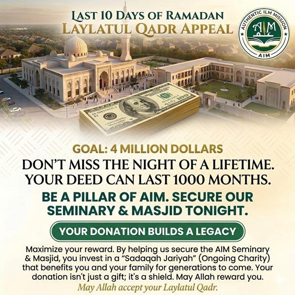 Every brick laid, every letter of the Quran taught, and every prayer offered in this Masjid will be a weight on your scale of good deeds. By helping us secure the AIM Seminary & Masjid, you aren’t just giving money; you are investing in a “Sadaqah Jariyah” (Ongoing Charity) that will benefit you and your family for generations to come.